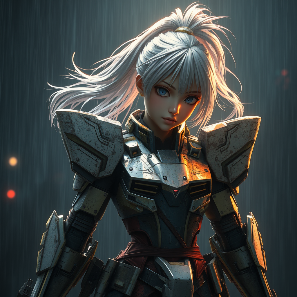 A girl in battle-damaged Gundam armor stands defiantly on a dark, rainy night. Her white hair is pulled into a ponytail, whipping in the storm as she fights fiercely, the epic scene unfolding around her. The armor is scuffed and worn from battle, yet still gleams amid the rain, capturing reflections and shimmering with an otherworldly glow. The scene is styled like Borderlands, with extreme detail and vibrant colors, highlighted by cinematic lighting that creates an atmosphere both surreal and divine. This hyperrealistic, almost celestial battle takes on a manga and anime aesthetic, portraying a world full of intricate, detailed environments. Rendered with Unreal Engine 5, the Lumen reflections and Octane rendering bring the scene to life in 3D, capturing the intensity and emotion of the fight. Despite the chaos, the girl's features remain focused and determined, embodying strength and resilience amidst adversity.