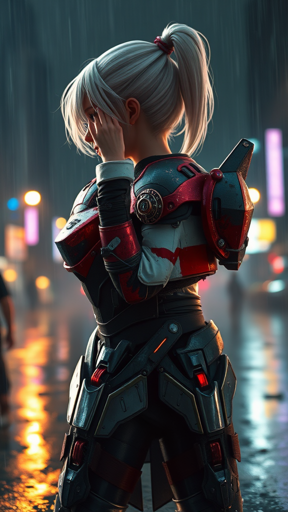 A girl in battle-damaged Gundam armor stands with determination, her white hair pulled back into a sleek ponytail. It's a dark, rainy night, setting the stage for an epic fight scene. She is visibly wounded from the battle, yet her spirit remains unbroken. The environment is rendered in a Borderlands style, with extreme details and a cinematic atmosphere, capturing the essence of a masterpiece. The scene is painted with stunning photography effects, featuring a surreal, divine setting filled with celestial vibes reminiscent of manga and anime. The lighting is cinematic and hyperrealistic, using Unreal Engine 5 for lifelike reflections and intricate detail. The armor gleams with shiny, smooth textures, contrasting against the vibrant, colorful backdrop. In this hyperrealistic, visually immersive world, she stands as a warrior, a stunning illustration of resilience and strength, painted with the detailed precision of a 3D render.