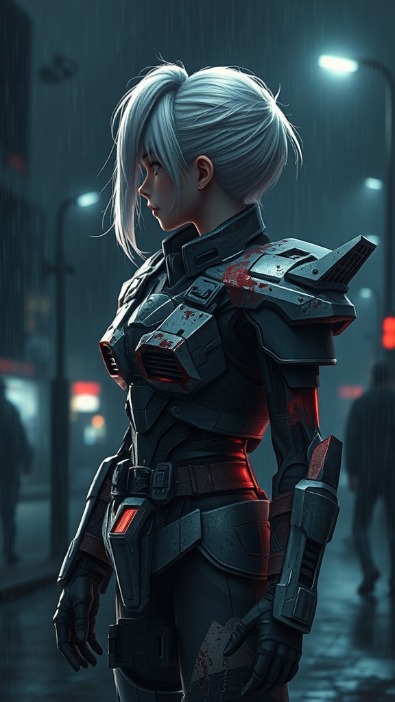 A girl in battle-damaged Gundam-inspired armor stands amidst a dark, rainy night scene, her white hair pulled back in a ponytail. The atmosphere is charged with the intensity of an epic fight, highlighting her wounds from the skirmish. The style is reminiscent of Borderlands, with extreme detail and a cinematic essence. The environment is stunning, with a surreal and divine quality, blending manga and anime influences. Hyperrealistic textures and intricate details illuminate the image, enhanced by cinematic lighting and vibrant colors. Using Unreal Engine 5, the scene features remarkable lumen reflections and a 3D render quality akin to octane render. This masterpiece captures a unique, surreal, and focused composition. Despite low-resolution issues like text errors and JPEG artifacts, the image maintains its captivating core concept, avoiding low quality or poorly drawn elements.