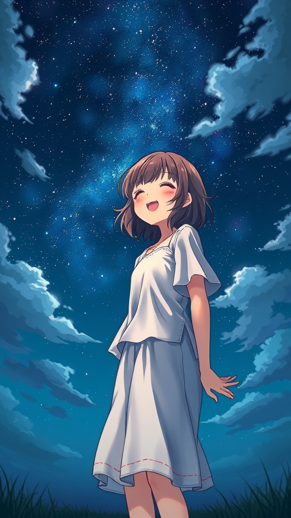 A girl in delicate clothing stands under a starry night sky, reminiscent of Oyari Ashito's style, capturing the essence of satisfaction and contentment. The scene is portrayed with manga and anime aesthetics, highlighting her joyful expression amid dark exposure and vibrant colors. The night envelops with deep tones and scattered clouds, while the artwork reflects exceptional quality and intricate details, offering a first-person perspective in a 9:16 aspect ratio.