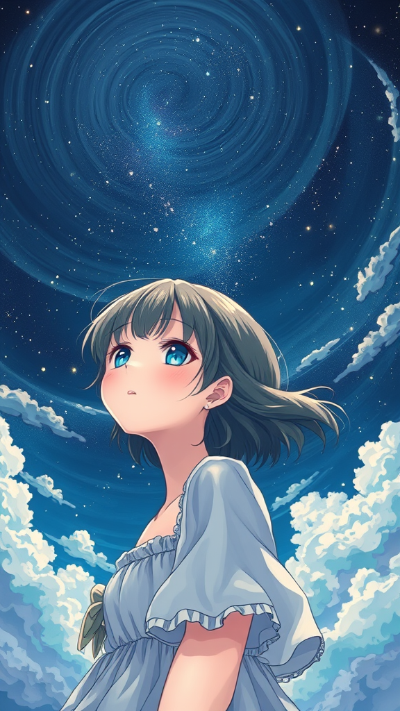 A girl in ethereal attire under a starry night sky, capturing the essence of summer; her expression embodies serenity and innocence, exuding a dreamy aura. Illustrated with manga graphics and anime influences, the scene is a portrait of dark exposure combined with vibrant colors. The artwork, inspired by Oyari Ashito's style, showcases high quality and intricate detail. From a first-person perspective, the atmosphere is enriched by deep tones and swirling clouds, blending harmoniously against the darkened backdrop.