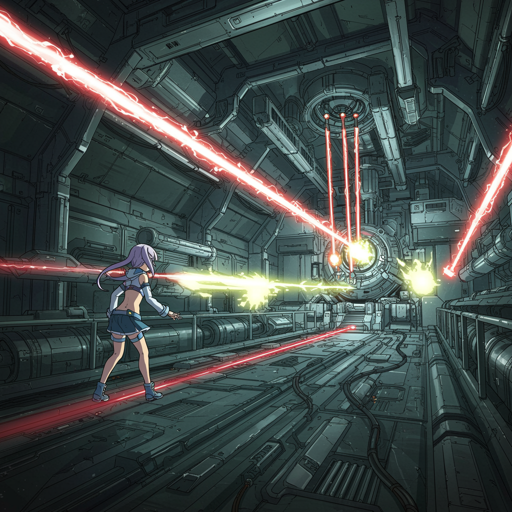A girl in futuristic attire navigates the interior of a colossal spaceship, inspired by Tsutomu Nihei's signature style and the universe of Sidonia no Kishi. The scene features a multi-story space filled with hyper-detailed, sci-fi elements, including a massive laser generator at the core. Energy clots and beams of light flash around her as they accelerate throughout the space, creating a sense of speed and motion. The setting is a futuristic and highly detailed anime drawing, utilizing 8K resolution with manga-style graphics. The visual captures the essence of first-person perspective, where the laser streaks and energy surges evoke a dynamic and immersive experience.