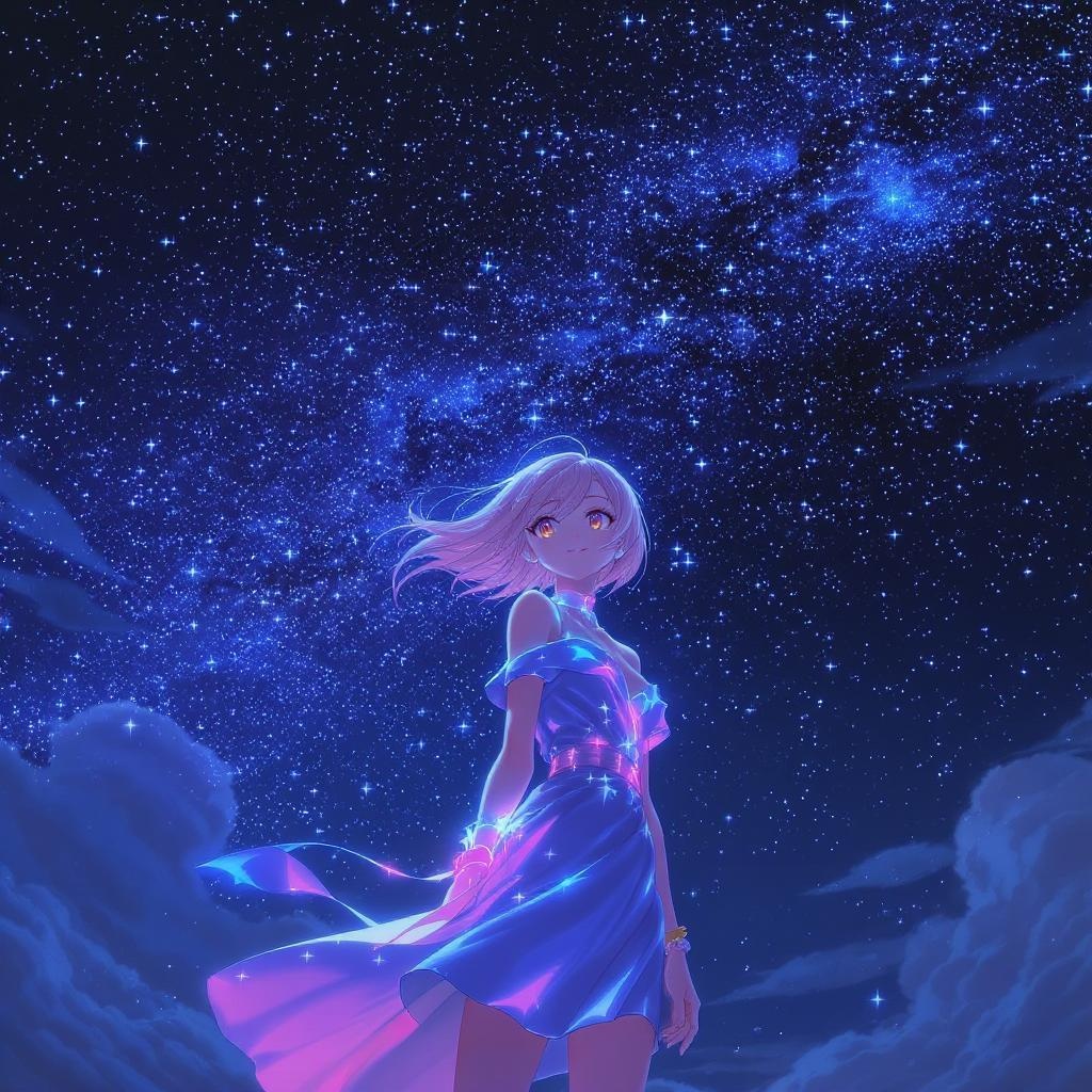 A girl in luminous attire stands against a star-studded night sky, capturing the serene satisfaction and pure enjoyment of the scene. Inspired by the style of artist Oyari Ashito, her portrait exudes the intricacies of manga graphics and anime artistry. With an emphasis on high-quality, detailed rendering, the composition plays with dark exposures contrasted by vivid colors that illuminate her presence. From a first-person perspective, the dark tones of the scene are softened by ethereal clouds, creating a harmonious balance between mystique and vibrancy in a 9:16 aspect ratio.