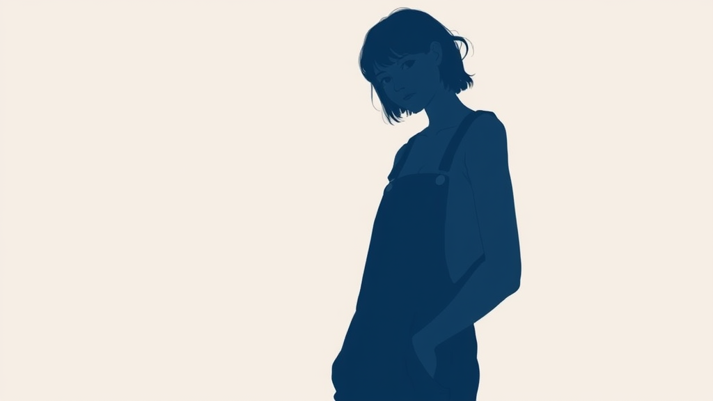 A girl in overalls poses gently for the camera, embodying the essence of Shige's visual style. Her silhouette exudes a wavy, dark azure hue, capturing a minimalist beauty with a serene presence. Her posture is relaxed, almost as if slumped or gracefully draped, evoking a sense of fluidity. The gongbi influence is evident in the delicate detailing, with an air of frayed elegance adding depth and intrigue to the overall composition.