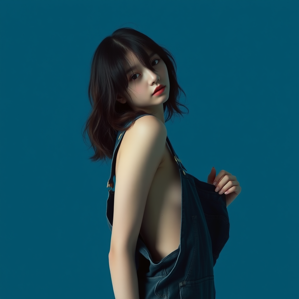 A girl in overalls poses languidly for the camera, embodying Shige's visual aesthetic with wavy strands and a dark azure palette. Her minimalist beauty is accentuated by a slumped, draped posture. The piece is crafted in a gongbi style, with subtle frayed edges, evoking an ethereal and serene atmosphere.
