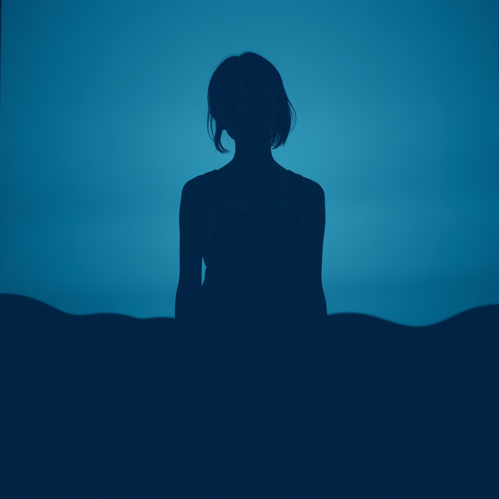A girl in overalls stands for the camera, capturing a scene infused with Shige's unique visual style. Her silhouette, framed amidst wavy lines and dark azure tones, exudes a sense of minimalist beauty. Her posture is naturally slumped, her overall edges slightly frayed, contributing to an effortless elegance. The image echoes a gongbi technique, with fine and delicate touches that enhance the atmospheric simplicity.