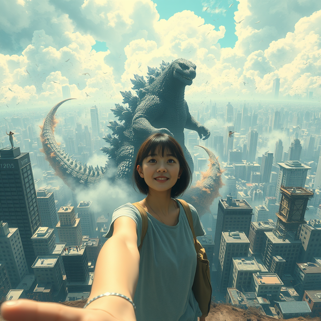 A girl is casually taking a selfie as chaos unfolds behind her; Godzilla wreaks havoc on a sprawling cityscape, buildings crumbling under his might. Amidst the destruction, tiny figures of panicked people scatter, their frantic movements contrasting with the girl's calm pose. The scene is depicted in a photorealistic style, blending the intricate detail of Beeple's art with the whimsical touch of Studio Ghibli, creating a surreal yet mesmerizing juxtaposition.