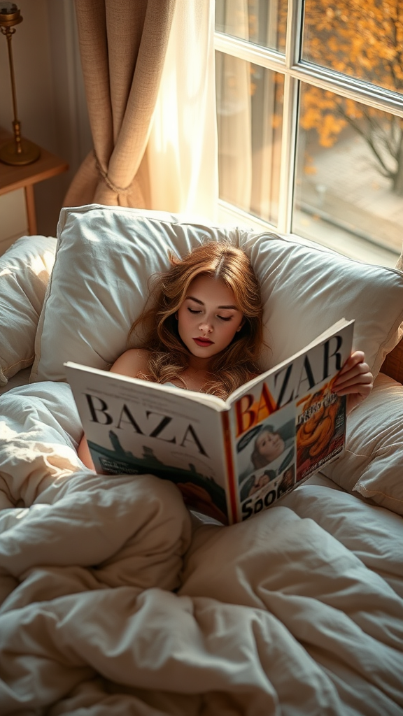 A girl reclining on a cozy bed, encircled by soft, plush pillows, leisurely reads a BAZAAR magazine; captured by Alexandr Tikhomirov; intricate details; stunningly attractive features, ethereal ambiance, lightness; hyper-realistic image quality -- with a gentle autumn light filtering through the window, casting a warm, golden glow -- hint of a fragrant candle flickering softly on the nightstand, adding a touch of intimacy and tranquility to the scene.