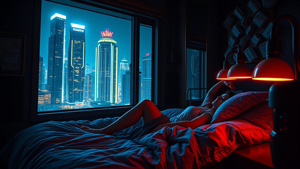 A girl relaxes in her bed within a neon-lit room, exuding a cyberpunk atmosphere. The room is illuminated by glowing lights, casting a photorealistic ambiance reminiscent of Unreal Engine 5. Through the window, towering skyscrapers of a futuristic cityscape stand illuminated in the night. The room is intricately detailed, reflecting a deviantart style with sharp, stunningly beautiful sci-fi elements. The dystopian setting is enhanced with cinematic lighting, highlighting iridescent gold accents. Despite the dark and gritty vibe, the scene captures a poignant serenity.