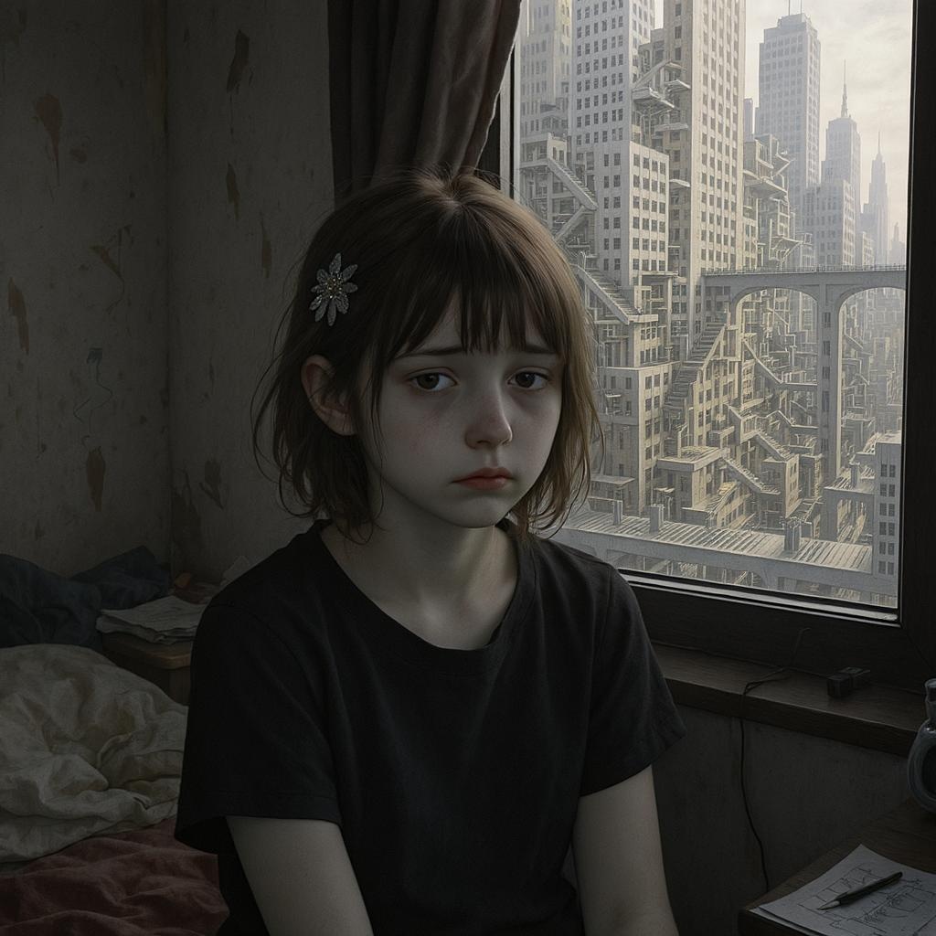 A girl sits alone in a messy room, her short brown hair adorned with a delicate hairclip and ornament, bangs framing her expressionless face. She wears a simple black t-shirt, her brown eyes gazing distantly with a deadened look, revealing a sense of inner turmoil and depression. Beyond her, the intricate cityscape unfolds through the window, with towering skyscrapers creating a maze-like effect reminiscent of Maurits Escher’s compositions. The perspective is dizzying, with stairways and bridges weaving into an endless horizon. A subtle yet profound connection between her internal chaos and the complex urban labyrinth outside permeates the scene, as if both worlds mirror each other's depth and intricacy.