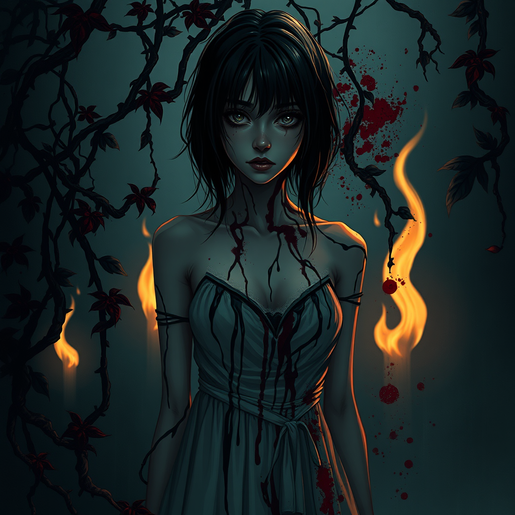 A girl stands in a high-cut dress, her skin streaked with black veins as if dripping oil, entwined by predatory plants and sinister ivy. Her face, framed by shadows, gazes with a haunting intensity. The scene is gloomy, punctuated by splashes and smudges of deep red, as if blood or paint. In the background, flames cast an eerie glow, enhancing the drama of the setting. This fine art illustration captures a balance of darkness and light, with cinematic artificial lighting and a rim lighting effect highlighting the girl's enigmatic presence, creating an 8K masterpiece with an impactful atmosphere.