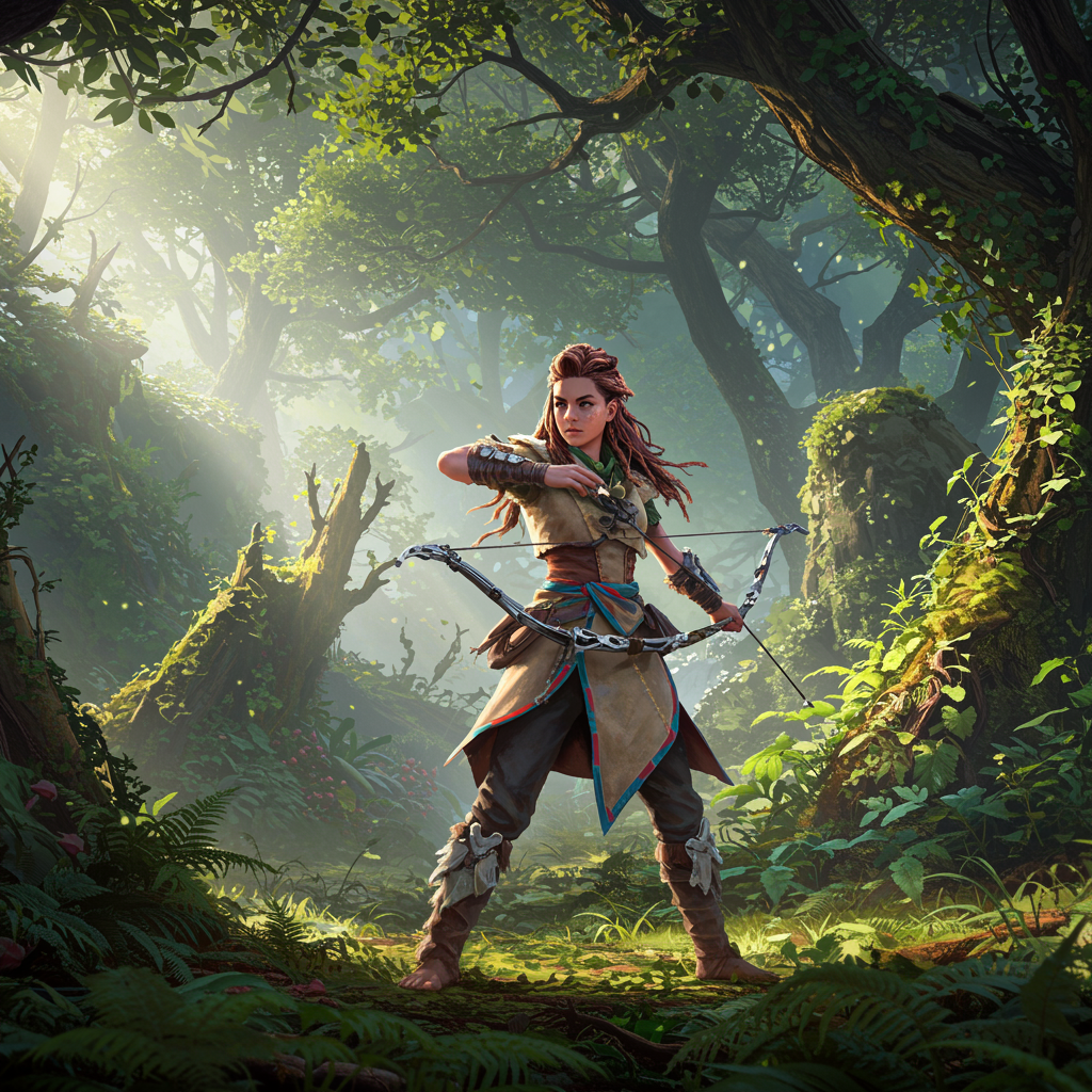 A girl stands poised in a lush forest, surrounded by vibrant greenery with sunbeams filtering through the canopy. She's dressed in attire reminiscent of a tribal warrior, a delicate blend of nature and craftsmanship. Her bow is drawn, the tension palpable as if she is one with the landscape, embodying the spirit of the hunt. The air is filled with the serene beauty akin to scenes from Horizon Zero Dawn, capturing a moment where technology and nature harmonize in a seamless dance.