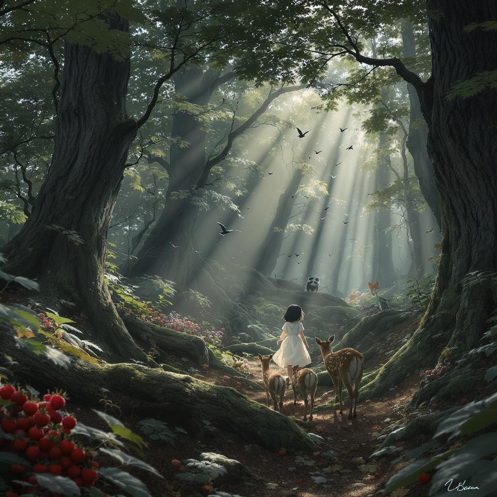 A girl wanders through an enchanting forest, the sun streaming through tall trees, casting dappled light on the forest floor. Birds glide overhead, their shadows flitting over the ground. Nearby, a group of curious fawns gather, their coats speckled with white. A mischievous raccoon scampers up a tree, while a sly fox watches from a distance, its eyes glinting with curiosity. Wild strawberries dot the undergrowth with vivid red. The scene holds a Miyazaki-esque charm, captured in stunning 8k resolution, with high definition contours and contrasting light that brings every leaf and animal into sharp focus. The depth of field is meticulously detailed, offering a photorealistic experience as though stepping into a living dream. In the foreground, the texture of bark and foliage is ultra-realistic, every surface rich and textured, evoking a cinematic intensity. Everything seems larger than life, as if viewed through the eyes of a giant. The dark tones add an air of mystery, and a gentle bokeh effect blurs the background, creating an epic frame that is both immersive and ethereal, filled with super realistic textures and a touch of magic.