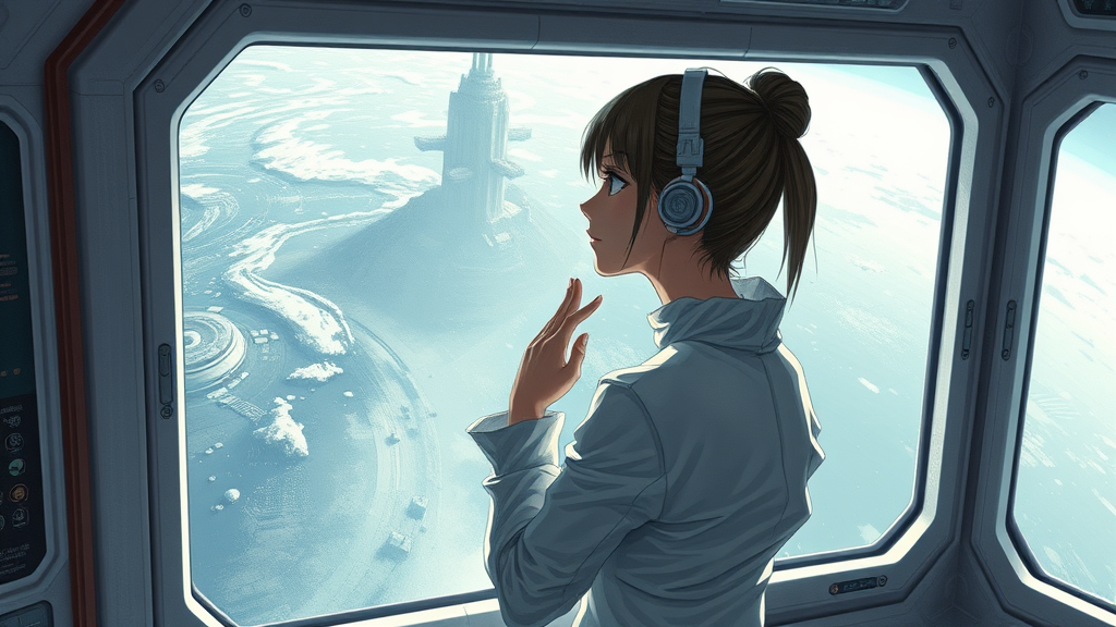 A girl wearing a snug white jumpsuit gazes out the window of a spaceship, capturing a futuristic anime and manga aesthetic. The digital artwork reflects an impressionistic style with intentional low resolution and various visual glitches like jpeg artifacts. The scene incorporates unconventional and abstract elements, presenting distorted features, blurred outlines, and unusual proportions. Her form is reflected with duplicated, mirrored aspects, with a sense of surrealism in the elongated neck and exaggerated limb anatomy. There's a dreamlike, mutable quality to her appearance, adding an artistic layer to the cosmic environment.