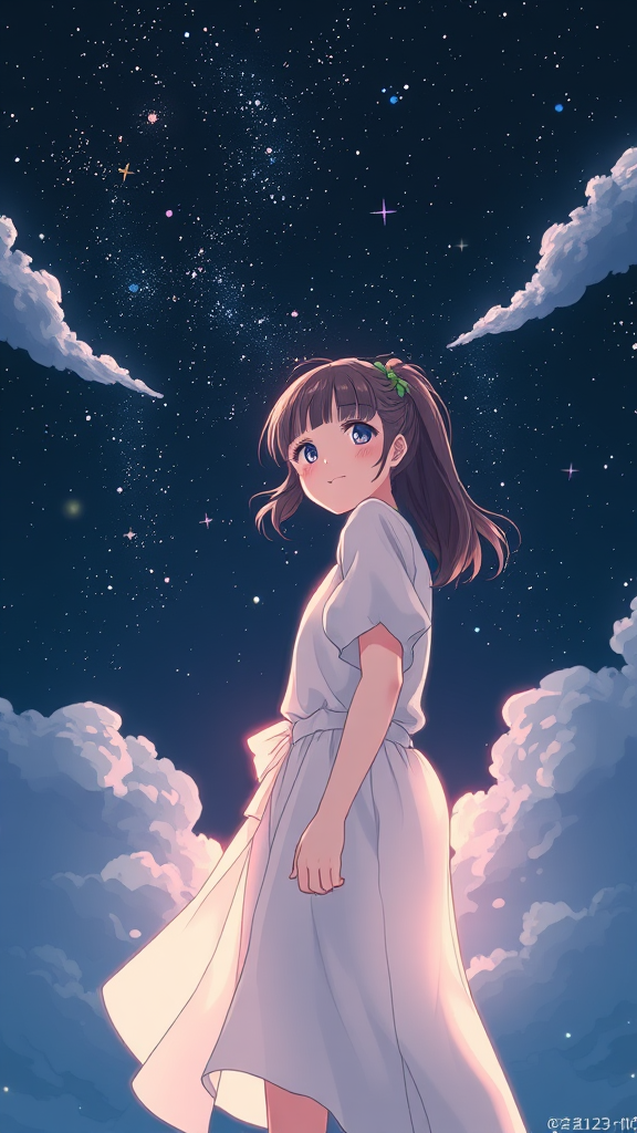 A girl wearing ethereal light clothing stands beneath the starry night sky, her expression a mix of satisfaction and enjoyment. In the style of artist Oyari Ashito, the scene captures the essence of manga graphics and anime influences. Her form is softly illuminated, contrasting against the dark exposure of the night. The use of bright colors highlights her presence among the dark tones of the sky. Billowing clouds add depth to the scene, enhancing its high quality and meticulous detail, as if viewed through a first-person lens ratioed 9:16.
