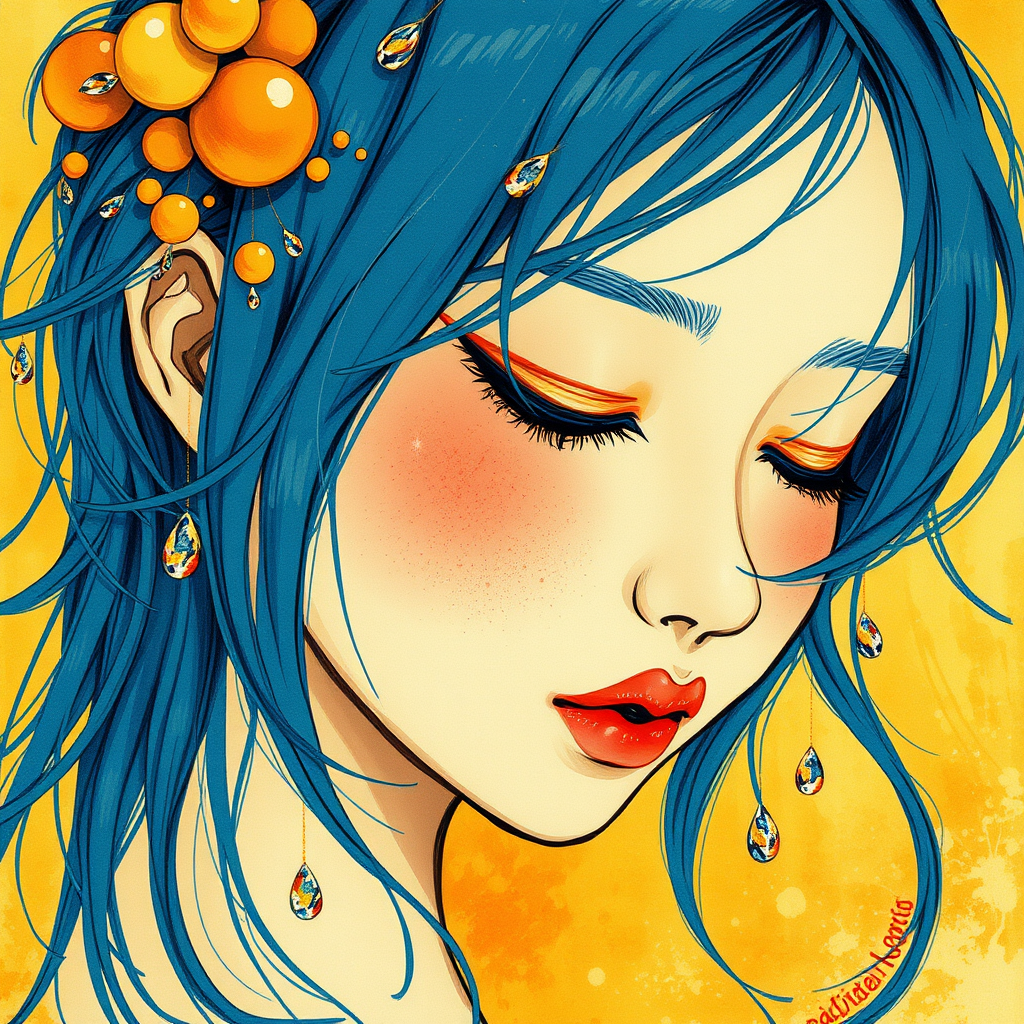 A girl with blue hair and eyes closed, in the style reminiscent of the stars art movement, enveloped in shades of yellow and orange. Her visage is adorned with delicate water drops, evoking a romantic illustration. The image features intense lines and combines the intricacy of gongbi with a loose paint application, creating a harmonious balance of precision and fluidity.