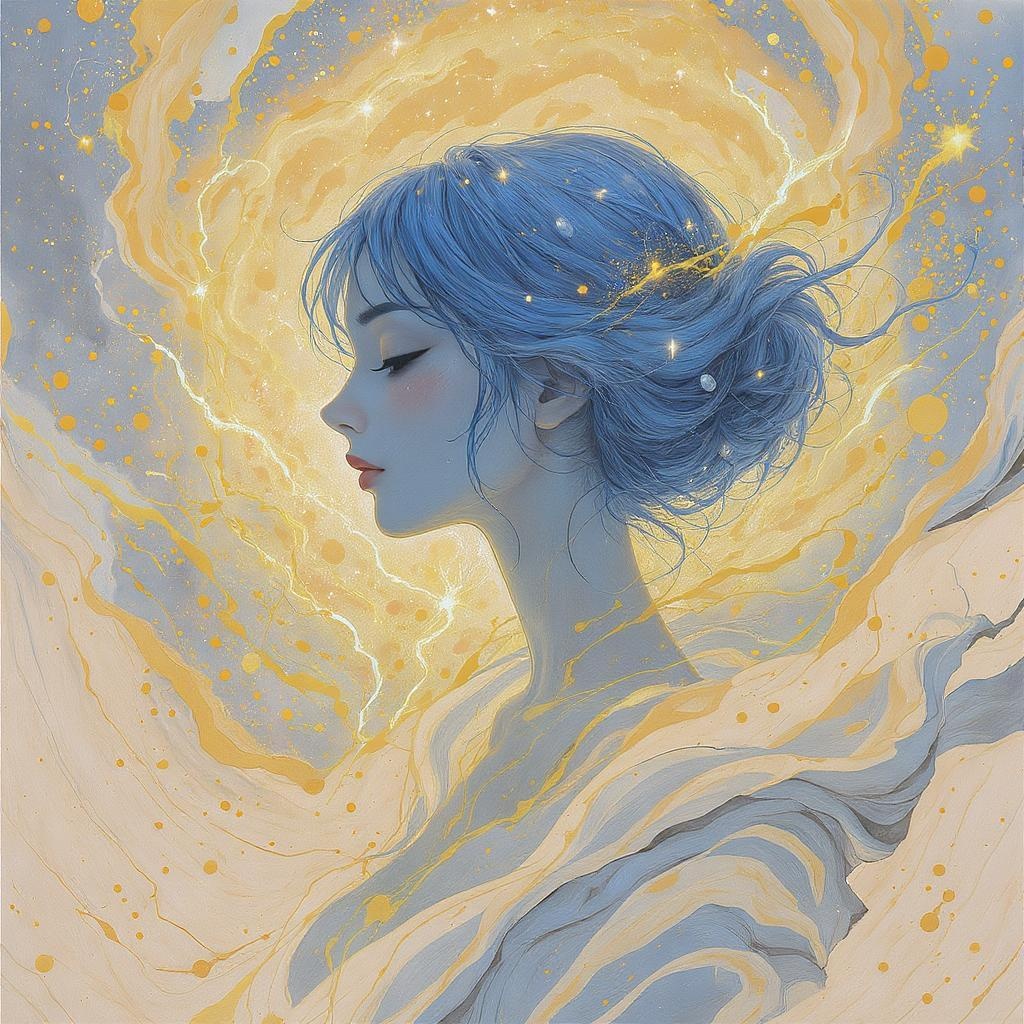 A girl with blue hair and eyes closed stands serenely, surrounded by an ethereal aura, her silhouette framed by a cosmic dance of yellow and orange hues. Delicate water droplets adorn her hair like tiny stars, catching the light and enhancing the romantic ambiance. Her form is rendered in the detailed, intricate style reminiscent of gongbi, yet bursts of loose paint application add an expressive, almost dream-like quality. Intense lines trace her features, capturing both strength and vulnerability, while the celestial palette evokes a sense of wonder and tranquility.