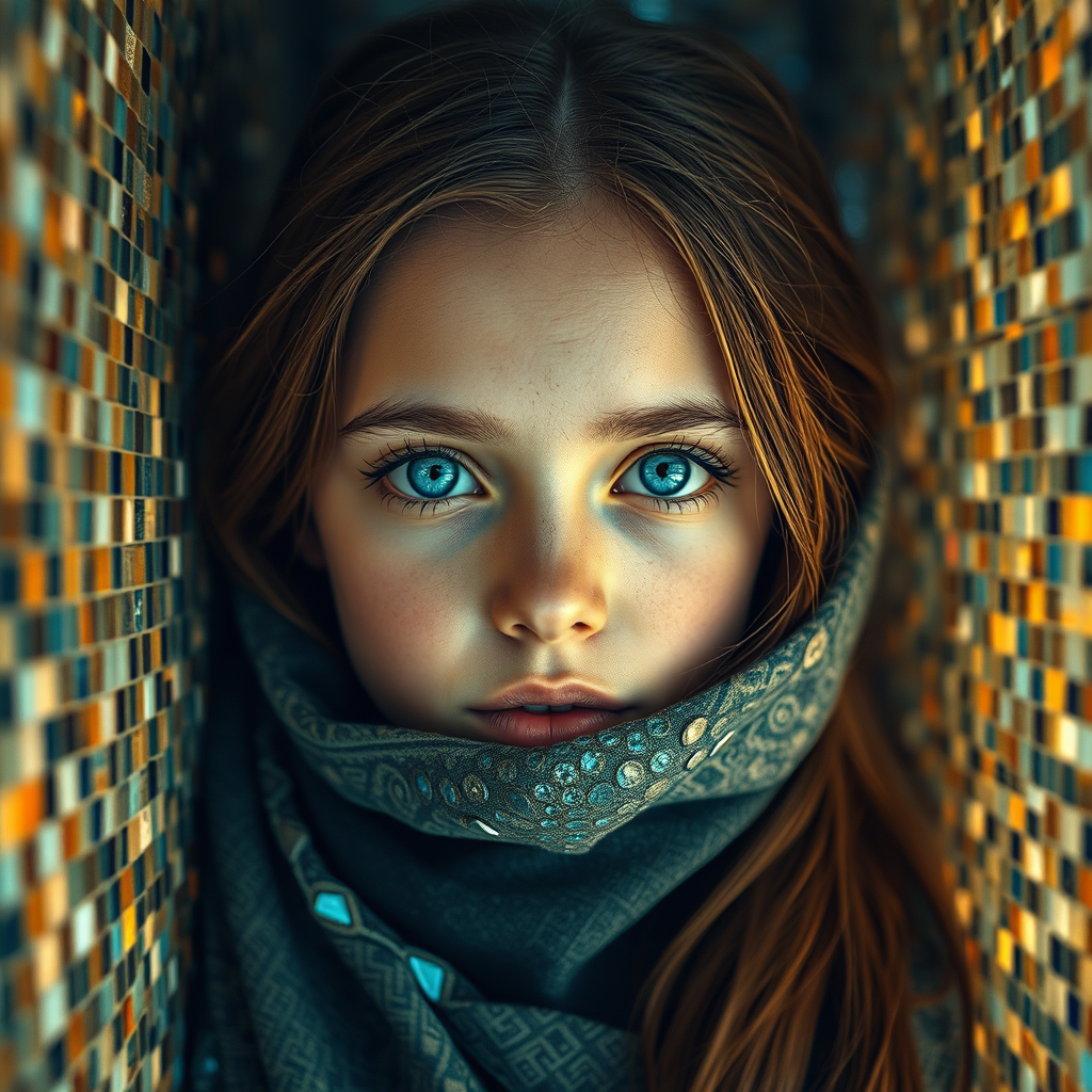 A girl with captivating blue eyes surrounded by an array of intricate mosaic tiles, capturing full spectrum color and stunning detail. The scene is cinematic and aesthetically dramatic, with a coherent and vibrant light that enhances the complex and glowing beauty of the setting. The arrangement is rich with striking symmetry and surreal elements, creating an elaborate and epic visual narrative. The scene conveys a sense of thoughtfulness with deep, iconic colors that are fantastically dynamic and artistically vibrant, culminating in a masterpiece that is both professional and awe-inspiring.