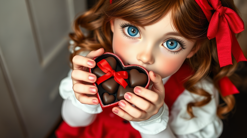A girl with chestnut-brown hair and striking blue eyes offers a heart-shaped box of chocolates, her hands gently presenting the gift. Her cheeks flush with a timid blush, adding to her shy demeanor. She wears a white blouse adorned with lace, tucked under a red apron, and her outfit is accented with a delicate black ribbon. A red headband holds back her wavy locks, while white thigh-high stockings complete her charming ensemble.