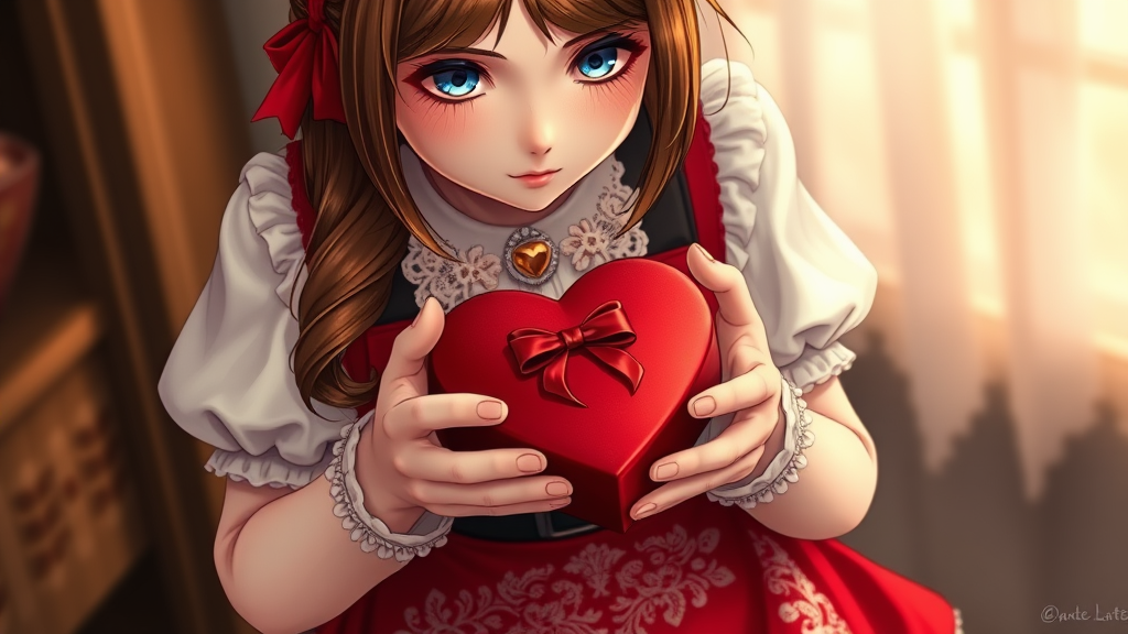 A girl with chestnut hair and sapphire eyes, gently presenting a heart-shaped box of chocolates with both hands, her cheeks slightly flushed as she shyly offers her gift. She is wearing a crimson apron decorated with intricate lace over a white blouse, accented with a black belt. Her outfit is completed with a scarlet hairband and ivory thigh-high stockings, adding a touch of elegance to her shy demeanor.