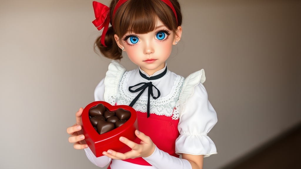 A girl with chestnut hair and sapphire eyes stands bashfully, holding a heart-shaped box of chocolates with a gentle, tentative gesture. Her cheeks are a warm blush as she extends her gift with both hands. She is dressed in an elegant white blouse adorned with delicate lace, a black ribbon around the collar, and a vibrant red apron that complements the ensemble. A crimson headband sits atop her head, and she wears white knee-high stockings that add a touch of playfulness to her appearance.
