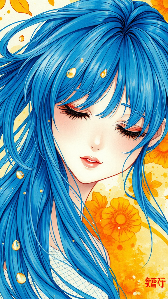 A girl with flowing blue hair and closed eyes, depicted in the ethereal style of the Stars art group, surrounded by hues of yellow and orange. Water droplets gently accentuate the scene, adding a romantic touch. The illustration features intense, intricate lines interspersed with areas of loose paint application, reminiscent of gongbi techniques. The composition evokes a sense of dreamlike serenity, with the play of colors and texture creating an enchanting visual narrative.