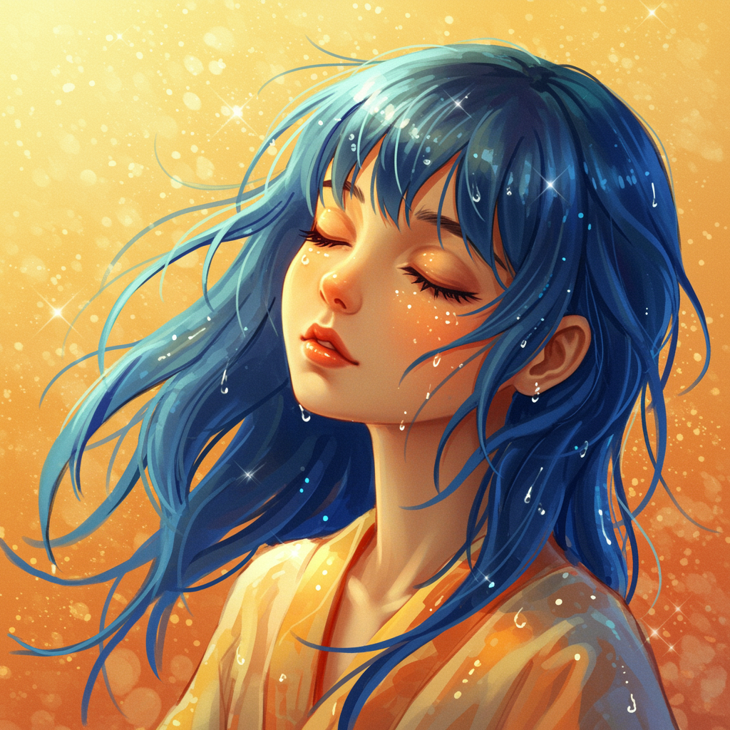 A girl with flowing blue hair and closed eyes, depicted in the style of the stars art group, with a palette of warm yellows and oranges. Her serene expression is adorned with shimmering water droplets. The scene is imbued with romantic undertones, featuring intense, expressive lines and a mix of gongbi technique with loose paint applications, capturing both precision and fluidity. The composition is elongated to emphasize elegance and grace, maintaining an ethereal and dreamlike quality.