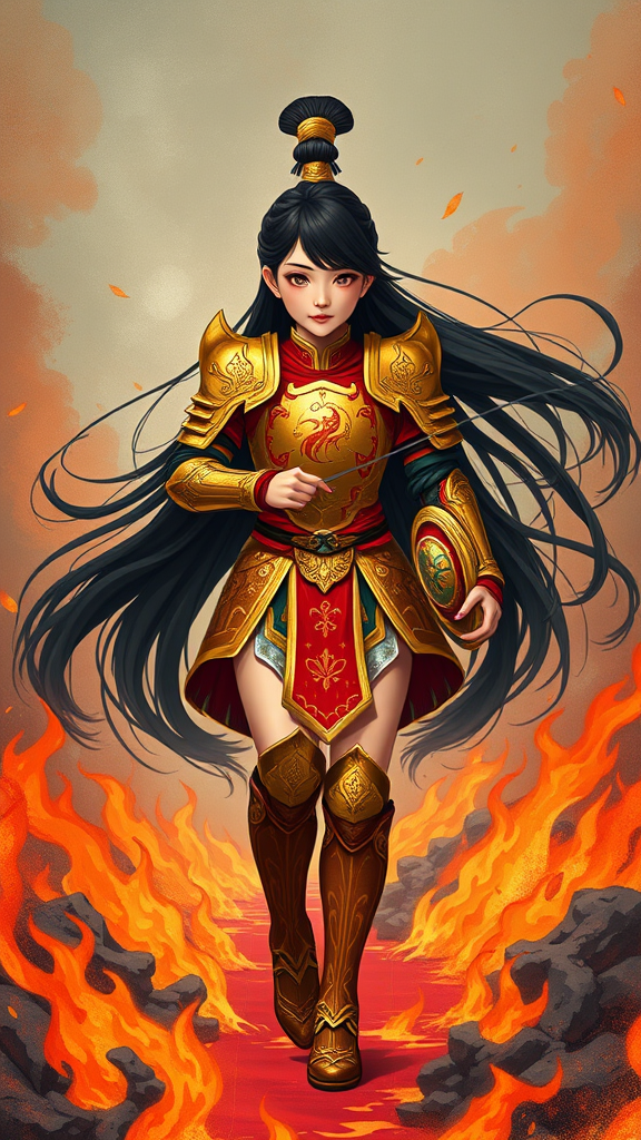 A girl with flowing long dark hair clad in intricate golden armor strides confidently across a path of flames, depicted in a style that blends the vibrant, patchwork creativity of Tristan Eaton with the delicate elegance of traditional Chinese painting. Her strong, determined facial expression exudes both grace and strength, reminiscent of Skottie Young's bold character designs combined with the soft, emotive brushstrokes of Michael Malm. The scene is rendered with a rich, cinematic quality akin to UE5, capturing her fearless journey amidst the fiery backdrop.