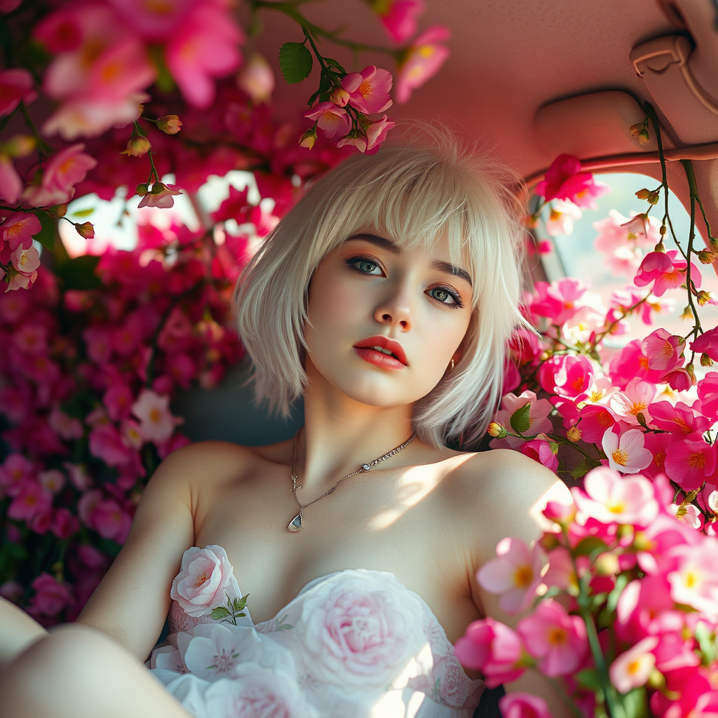A girl with platinum hair lounges in a vintage car overflowing with vibrant blossoms, art by Rinko Kawauchi, capturing naturalistic poses and exuding youthful energy. She wears a cool expression, with unexpected body adornments blending seamlessly with her surroundings. Flowers float gently in the air like a soft sky tapestry. Shot with an analog feel, the image boasts super details and a dreamy lo-fi aesthetic. The interior view, filled with a riot of colors, shows her enveloped in flowers and vines, embodying a sense of carefree adventure caught with a Fujifilm XT4, in a warm and inviting vacation dadcore style, set in a 3:4 aspect ratio.
