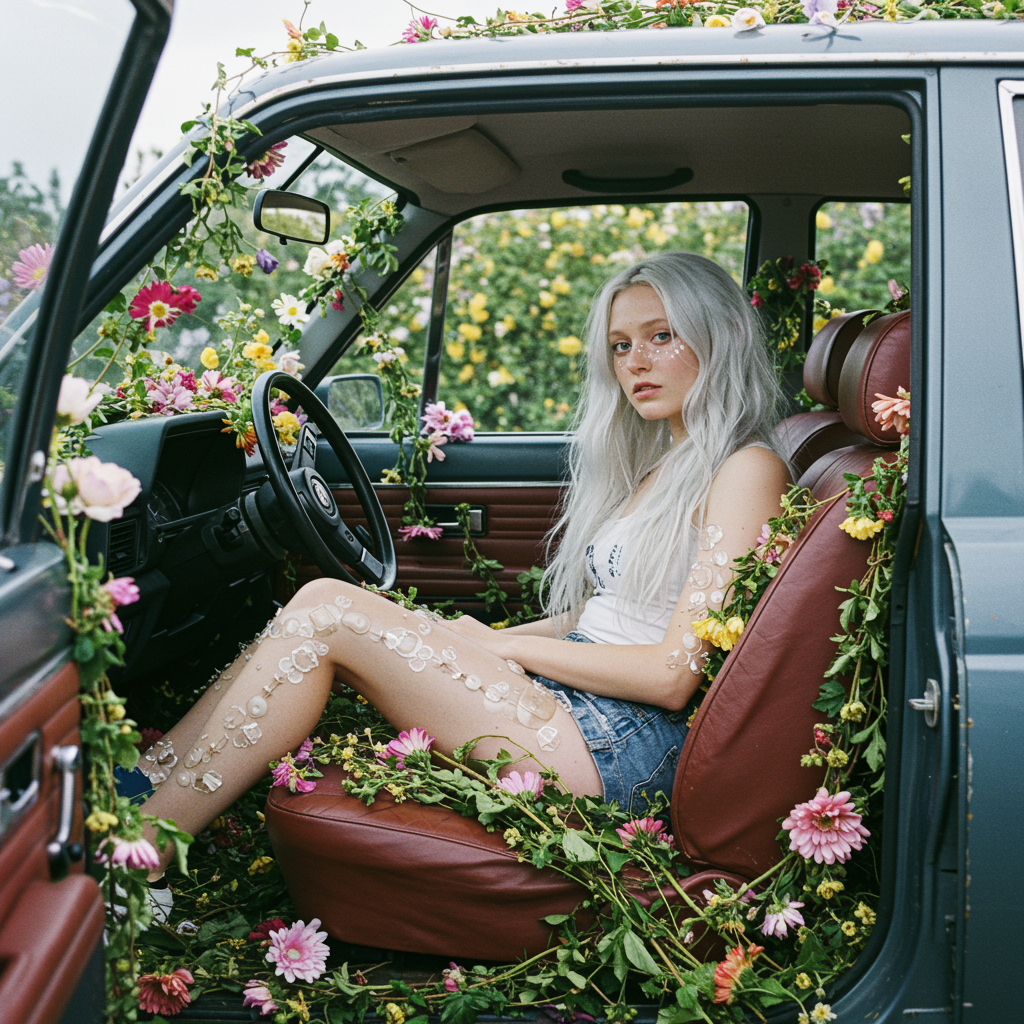 A girl with platinum white hair relaxes in a car overflowing with a vibrant array of flowers, exuding an aura of youthful energy and a cool expression. The scene captures the essence of vacation dadcore, with naturalistic poses and a subtle touch of whimsy. Delicate body extensions blend seamlessly with the lush greenery, as flowers seem to float in the sky outside. This dreamy lofi photograph, shot on a Fujifilm XT4, showcases super detailed, colorful imagery reminiscent of analog film. The interior is richly textured, with vines and blossoms playfully draping over the seats and dashboard, creating an enchanting and immersive experience.