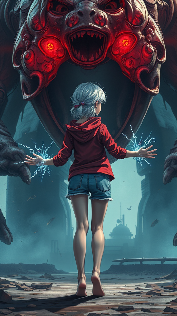 A girl with shimmering silver short hair emerging from beneath a chic hooded crimson jacket, clad in short denim, barefoot, facing off against an enormous creature in a post-apocalyptic setting with peculiar energy radiating from her hands. This scene is captured in a hyperdetailed painting, utilizing luminism and octane render, with Bar lighting accentuating the complexity. The concept art is set in an 8k resolution, inspired by the works of Martina Fačková, Prywinko Art, Artgerm, WLOP, Alphonse Mucha, Tony Taka, featuring fractal isometric details and bioluminescent elements. The cover photo is hyper-realistic, vivid in full color, hand-drawn with a bright yet gritty realism akin to Da Vinci and Erte. The image boasts intricate features with a hit definition, offering a cinematic view. It is a rough sketch blending bold dark lines with loose strokes, reminiscent of bold linework on paper, representing an actual human likeness.