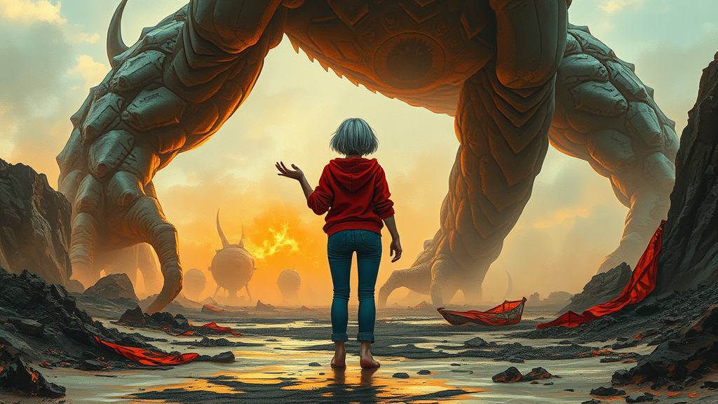 A girl with shimmering silver short hair peeking out from beneath a stylish hooded red jacket, wearing short jeans, stands barefoot amidst a post-apocalyptic landscape. Strange energy pulses from her hands as she faces a colossal monster. The scene is a hyperdetailed painting, utilizing luminism and octane rendering to create dramatic bar lighting. The art is intricate, featuring complex, 8k resolution concept art, inspired by Martina Fačková, Prywinko Art, Artgerm, WLOP, Alphonse Mucha, Tony Taka, with fractal isometrics and bioluminescent details. It is hyperrealistic, vibrant in full color, and expertly hand-drawn. Its style blends the bright and gritty, drawing from both Davinci's precision and Erté's elegance. The image is cinematic and bold, with a rough sketch quality and a mix of strong dark lines and loose strokes, capturing a real-life human essence on paper.