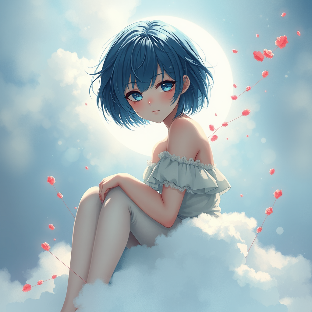 A girl with short azure hair and cerulean eyes sits gracefully on a fluffy cloud, her expression serene yet intense, rendered in an anime style. The scene is imbued with a mystical light that accentuates the hyper-detailed illustration. Delicate splashes of crimson form an intricate contrast against the ethereal backdrop, adding a sense of elegant tension to the composition. The digital painting channels the artistic flair of Artgerm, Greg Rutkowski, and Alphonse Mucha, combining a smooth, sharp focus with a touch of Art Nouveau sophistication.