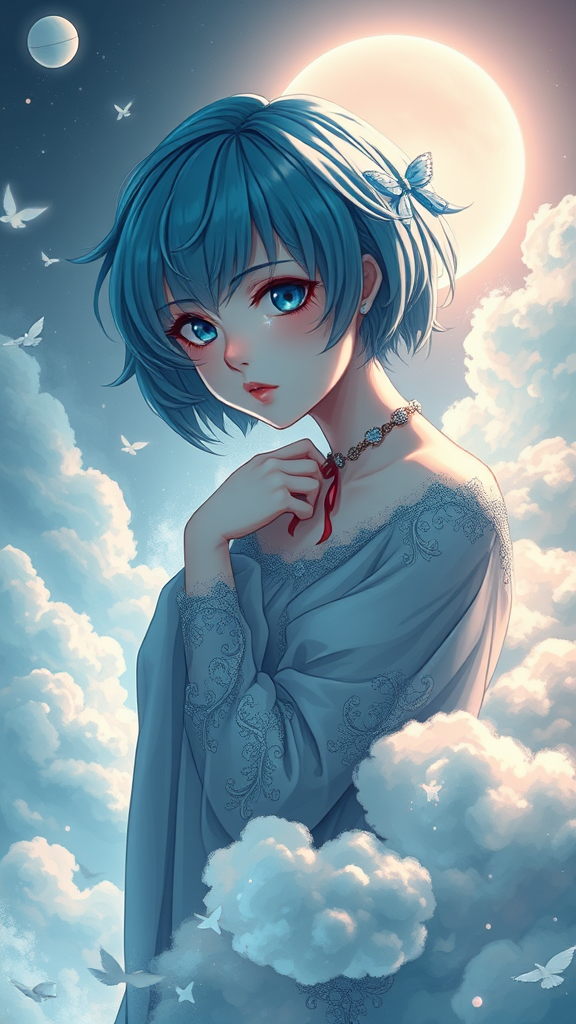 A girl with short azure hair and piercing blue eyes is perched gracefully on a cloud, rendered in an anime style with hyper-detailed illustration. The scene is illuminated by a mystical light effect, accentuating the elegance of her form. Her ethereal presence is both intricate and hauntingly beautiful, with subtle hints of crimson woven into the composition. The digital painting is smooth and sharp-focused, drawing inspiration from the artistic styles of Artgerm, Greg Rutkowski, and Alphonse Mucha. Fluffy clouds swirl around her, creating an enchanting and otherworldly atmosphere.