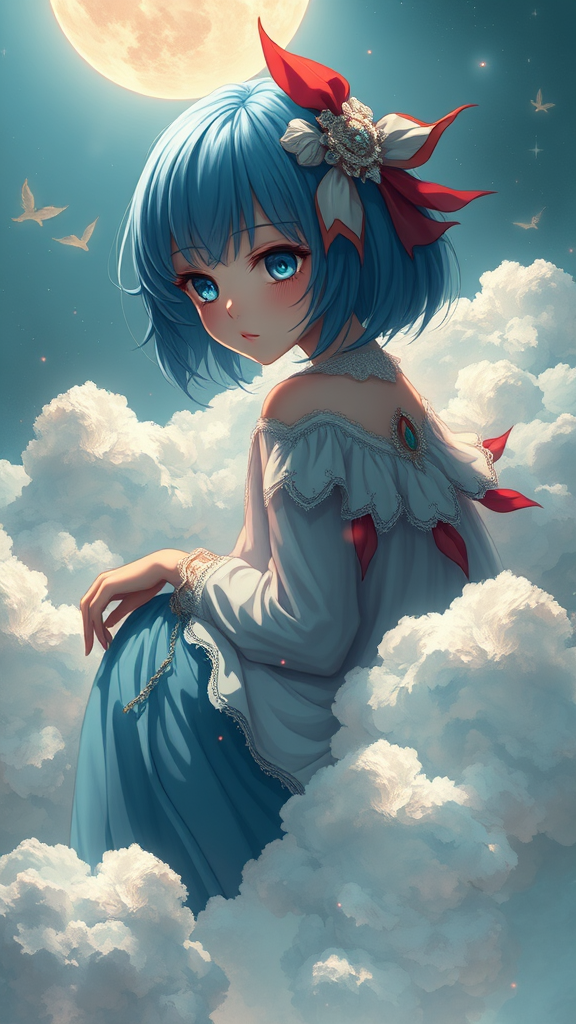 A girl with short azure hair and sapphire eyes is perched on a cloud, depicted in a hyper-detailed anime style with ethereal light effects. The scene is intricate and elegant, with a touch of the surreal. Her presence is haunting yet graceful, with crimson accents hinting at a mysterious past. This digital painting features a smooth and sharp focus, resembling the works of Artgerm, Greg Rutkowski, and Alphonse Mucha, showcasing a blend of art nouveau's flowing elegance and contemporary anime's vivid detail.