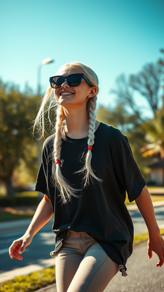 A girl with striking platinum hair, elegantly braided, sporting oversized sunglasses and a loose-fitting black T-shirt, effortlessly cruising on a skateboard through a sun-dappled park, captured in stunning detail with an 8k resolution using a Canon EOS-1D at f/5, showcasing photo-realistic textures and vibrant colors in a dynamic and lively scene.