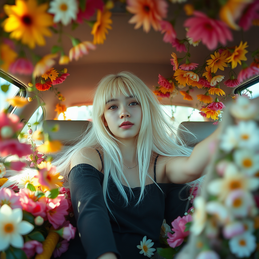 A girl with striking white hair sits calmly in a car overflowing with vibrant flowers, captured in the style of Rinko Kawauchi. Her natural pose exudes youthful energy and a cool, collected expression. Surrounding her are flowing body extensions intertwined with flowers, some appearing to float whimsically in the sky. This dreamy, lo-fi scene is shot on analog film with super detailed, colorful imagery. The car's interior is lush with flowers and vines that seem to breathe life into the space. The photograph, reminiscent of a vibrant, youthful vacation aesthetic, captures an intimate and dreamy moment with a touch of vacation dadcore flair, shot with a Fujifilm XT4 camera for a nostalgic yet contemporary feel.