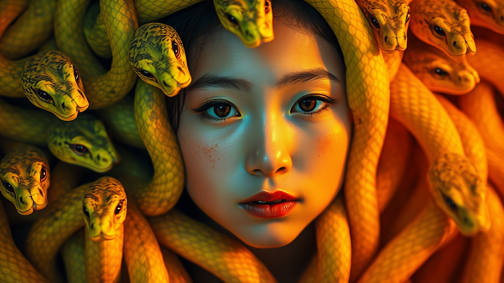 A girl's face surrounded by a myriad of green and yellow snake faces, set against a chinapunk backdrop, reminiscent of iconic album covers. The composition features a soft-focus portrait style, inspired by Luke Fildes, with a palette of light amber and silver hues. The scene is bathed in exotic, captivating lighting that enhances the mystical allure, resulting in a visual piece that is both striking and harmonious.