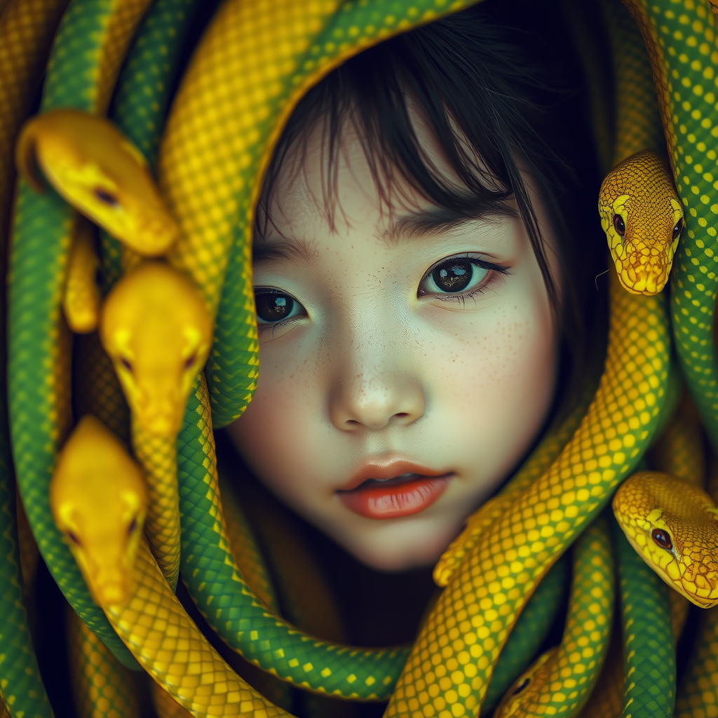 A girl's serene face emerges amidst an intricate weave of vibrant green and yellow snake heads, captured in a chinapunk aesthetic reminiscent of iconic album covers. The soft-focus portrait evokes the style of Luke Fildes, with light amber and silver hues casting an exotic, captivating glow. The composition is elongated, drawing the eye vertically, with each element harmoniously balanced, creating a dreamlike, otherworldly atmosphere.