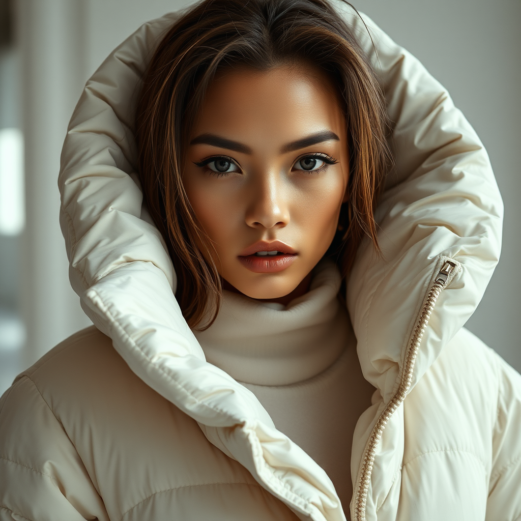 A glamorous and cinematic fashion portrait of an exceptionally striking female model draped in an oversized puffer jacket, designed by renowned brands such as Craig Green, Dingyun Zhang, Yeezy, Balenciaga, and Vetements. The scene is characterized by sharp focus and intricate detail, evoking a high-fashion, editorial vibe reminiscent of a glossy Vogue magazine shoot. The composition is symmetrical and luxurious, capturing the essence of modern fashion with an off-white color palette that emphasizes the chic and sophisticated allure of the ensemble.