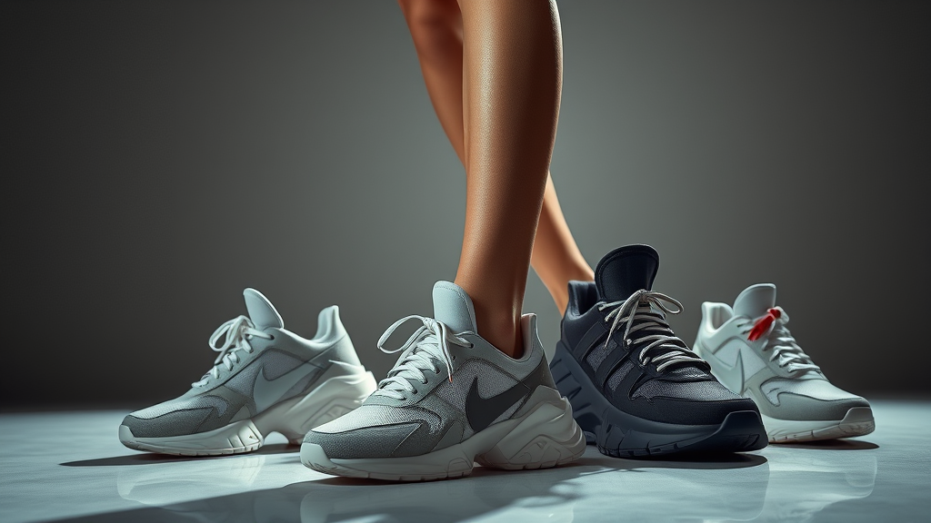 A glamorous and cinematic fashion shoot featuring sneakers designed by Craig Green, Dingyun Zhang, Yeezy, Balenciaga, and Off-White, worn by an elegant female model. The scene is well-lit, capturing every detail and texture of the sneakers, with a sharp focus and symmetrical composition. The overall vibe is editorial, akin to a high-fashion magazine spread, exuding a glossy and sophisticated allure. The imagery conveys a blend of modernity and luxury, highlighting the intricate designs and craftsmanship of each shoe.