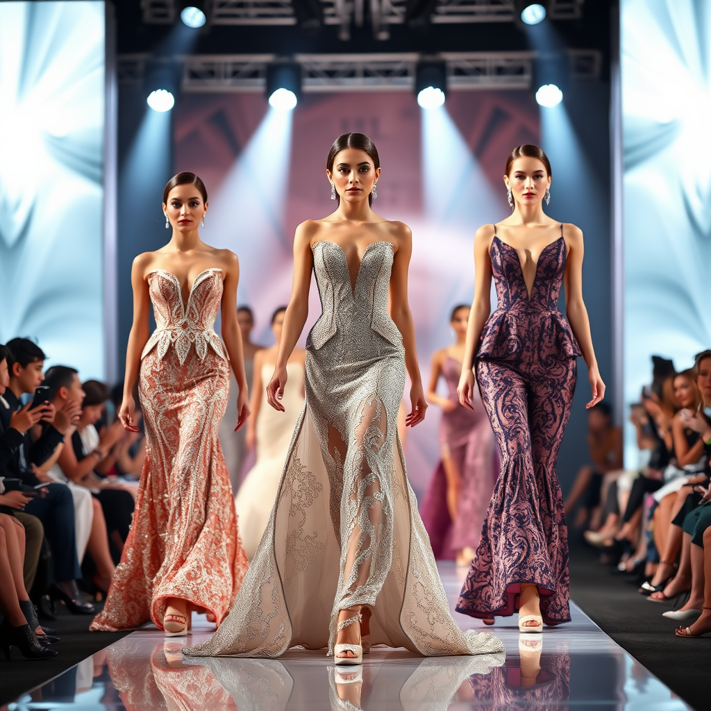 A glamorous display unfolds on the runway as models strut in breathtaking outfits, showcasing haute couture with intricate attention to the finest details. The catwalk gleams under bright spotlights, emphasizing the elegance and craftsmanship of each ensemble.