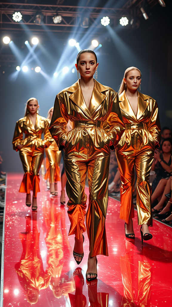 A glamorous fashion show featuring models in extravagant, oversized metallic foil ensembles, each outfit exuding haute couture elegance. The runway sparkles under dazzling spotlights, highlighting the intricate details and textures of the fabric. High heels elevate each look, creating a striking contrast with the voluminous suits. The atmosphere buzzes with the excitement of innovation and artistry, as every shimmering fold and gleaming accessory captures the audience’s gaze.