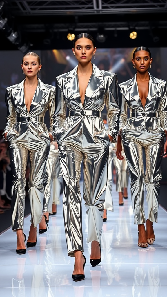 A glamorous fashion show showcasing breathtaking haute couture ensembles with models strutting confidently in extravagantly oversized metallic foil suits, paired with sleek, towering high heels; every tiny detail meticulously crafted, from shimmering textures to intricate accessories, all illuminated under the dazzling spotlights of the runway.