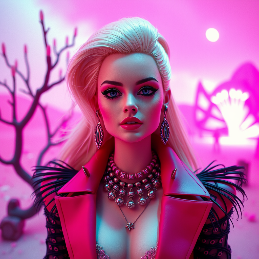 A glamorous fusion of Barbie elegance and Hellraiser's dark allure, featuring Margot Robbie as a captivating figure in a surreal pink landscape. Her striking attire blends iconic Barbie fashion with Pinhead's edgy aesthetic, creating an enigmatic vision. The scene is bathed in vibrant shades of pink, with hints of eerie, otherworldly elements woven throughout. The atmosphere balances whimsy and intrigue, offering a unique blend of charm and mystery in a 4:5 aspect ratio, evoking a sense of avant-garde storytelling and artistic flair.