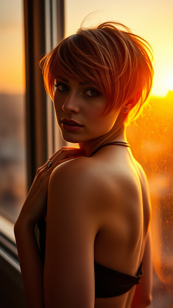 a glamorous portrait of a stunning young woman with an edgy, asymmetric haircut embodies a sleek cyberpunk aesthetic, her ethereal beauty shines through in 8k resolution with a 50mm lens at f/1.4, capturing each detail in sharp focus; she's posed in a classic cowboy shot with her arms elegantly placed behind her back, the warm glow of the sunset bathes her face as she stands by the window, enhancing her perfect anatomy with the dreamy golden light.