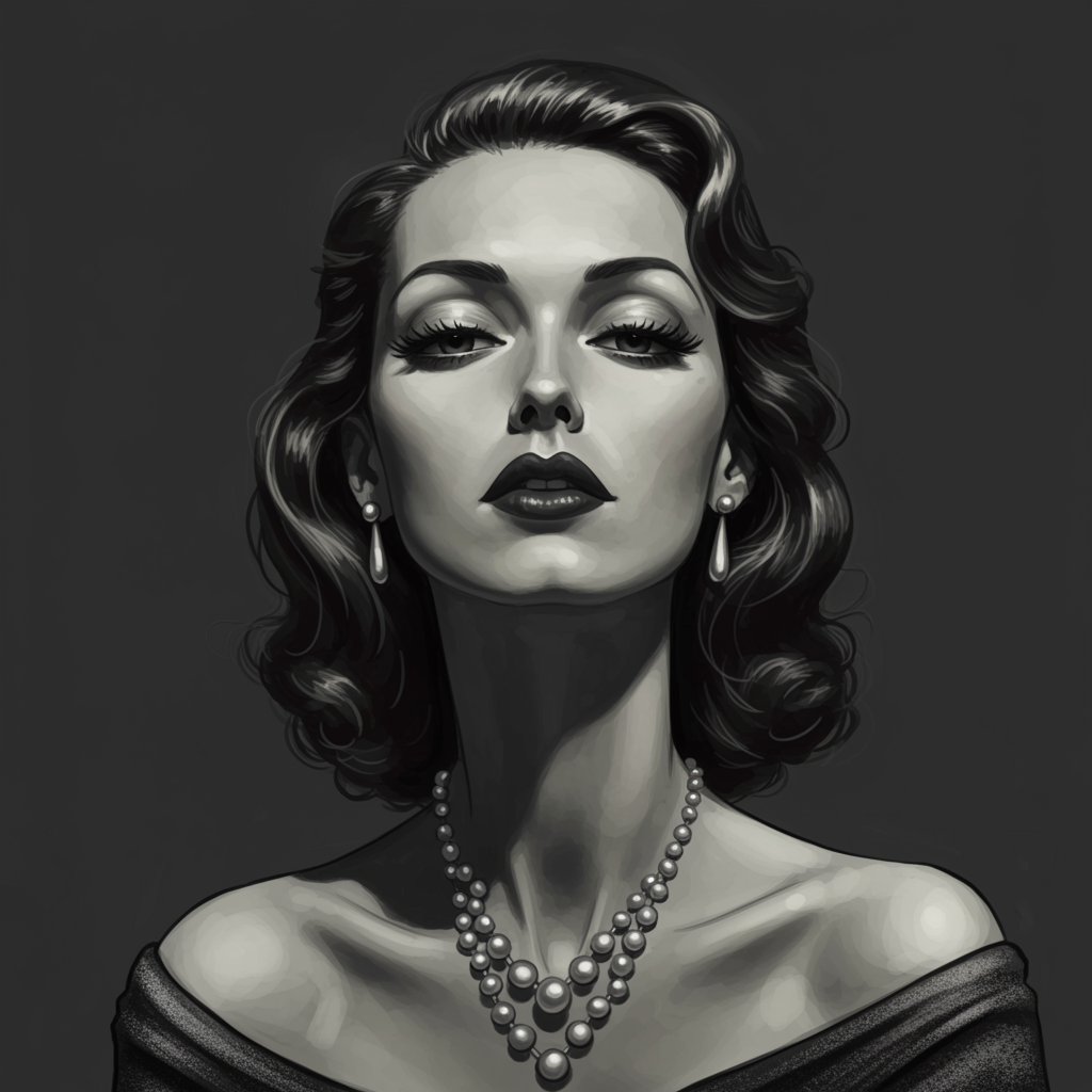 A glamorous woman with a vintage Hollywood look is depicted in a pop art style illustration. The artwork is rendered in shades of dark gray and light black, drawing inspiration from Mort Künstler and rollerwave influences. The piece exudes charm and captures the essence of large format film and painted illustrations. Despite intentional artistic imperfections—such as exaggerated features, blurred textures, and intentionally distorted proportions—the woman's captivating allure remains prominent. The portrayal plays with concepts of mutation and surrealism, presenting an imagined character with a unique and captivating presence. Elements like elongated neck, duplicated features, and abstract anatomy contribute to the creative narrative, offering a blend of classic beauty and avant-garde interpretation.