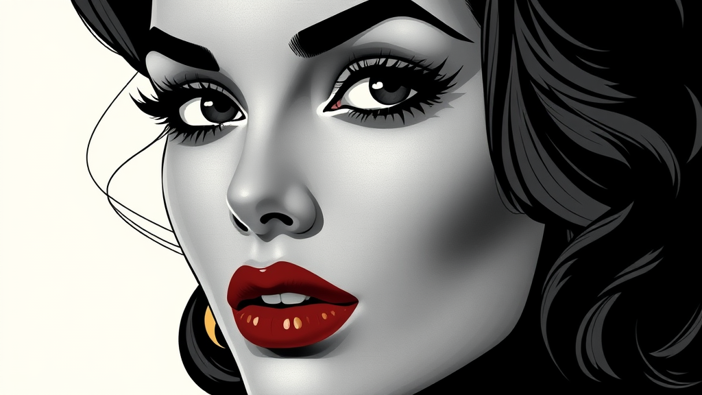 A glamorous woman's face in a pop art style illustration, inspired by classic Hollywood portraits, with shades of dark gray and light black. The style reflects the influence of Mort Künstler and rollerwave aesthetics, evoking charming character illustrations reminiscent of large format film and painted artistry. Her expression exudes elegance, though with intentionally exaggerated features that challenge conventional beauty norms. The image playfully experiments with surreal elements, presenting a face with abstract proportions and imaginative details, blending reality with fantasy. The composition subtly incorporates hints of cinematic flair, evoking a sense of nostalgia while maintaining a fresh and creative perspective.