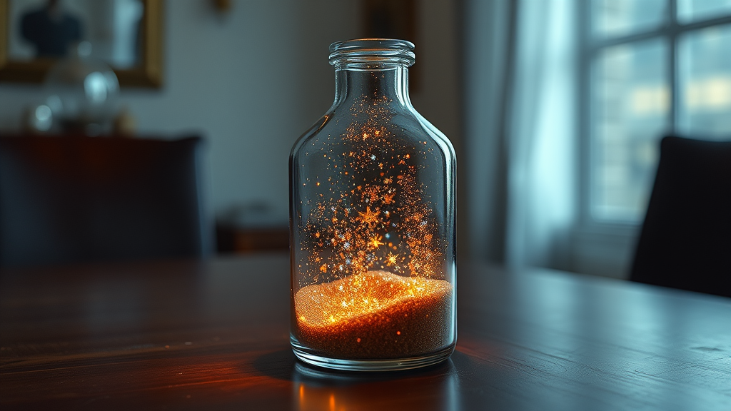 A glass bottle rests elegantly on a table, captured in a photorealistic painting. The artwork, reminiscent of a Pexels photograph, embodies a fusion of conceptual art with a modern fantasy touch. Stars and galaxies swirl within the bottle, creating a highly detailed and perfectly rendered scene. Light effects dance around the bottle, illuminating glittering multiversal ornaments that seem suspended in time. It's a universe encapsulated in a grain of sand, achieved through stunning photo manipulation. The composition is breathtakingly beautiful, seamlessly blending reality with cosmic wonder.
