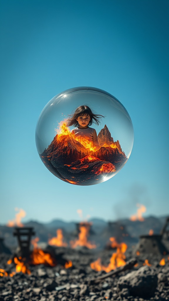A glass orb floats in a clear blue sky, containing an intricately detailed planet ablaze with fiery mountains and forests. Beyond the orb, the background reveals a post-apocalyptic world consumed by flames. Ashes and embers dance across the scene. Within the orb, a beautiful young girl is trapped, her presence adding an element of poignancy to the fiery chaos.